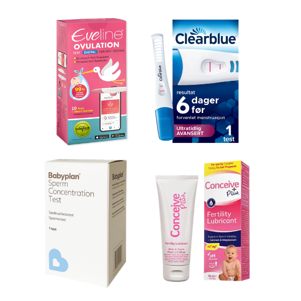 - Dekker hele fertilitetsreisen i ett kjøp — eggløsningssporing, sædtest, glidekrem og tidlig graviditetstest