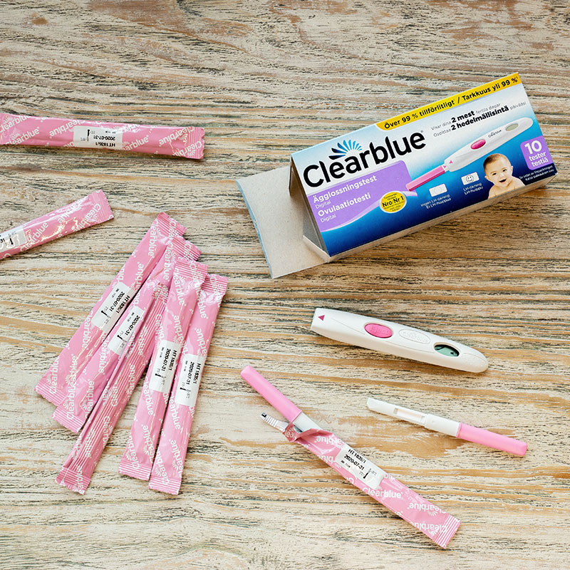 • 1 pk. Clearblue Digital Eggløsningstest (10 stk. testpinner + 1 gjenbrukbar avleser)